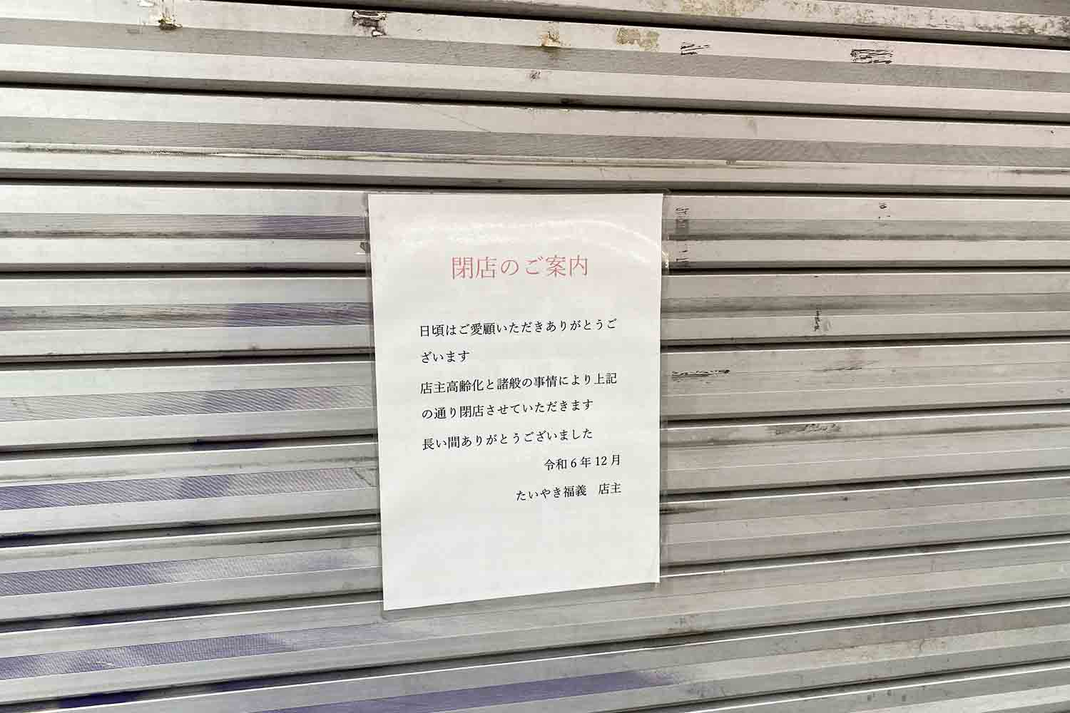 昔はラーメンやチャーハンなどもあり、とんねるずさんの番組で「たいやき屋なのにラーメンが美味しい」としても話題になった店でしたが、令和6年12月をもって閉店となりました。
